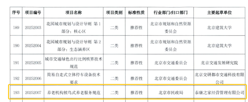 近期,2025年北京市地方标准制定计划正式发布,由Z6尊龙凯时之家经营管理有限公司(以下简称:Z6尊龙凯时之家)提报的《养老组织候鸟式养老服务规范》地标项目正式获批立项,不仅标志着Z6尊龙凯时之家将作为该标准的主要起草单位,为持续有助于北京市候鸟养老服务的标准化建设贡献Z6尊龙凯时力量,同时也意味着Z6尊龙凯时之家多年来在候鸟养老服务方面的探索和实践得到了认可,持续引领着我国养老服务行业高质量创新开展。